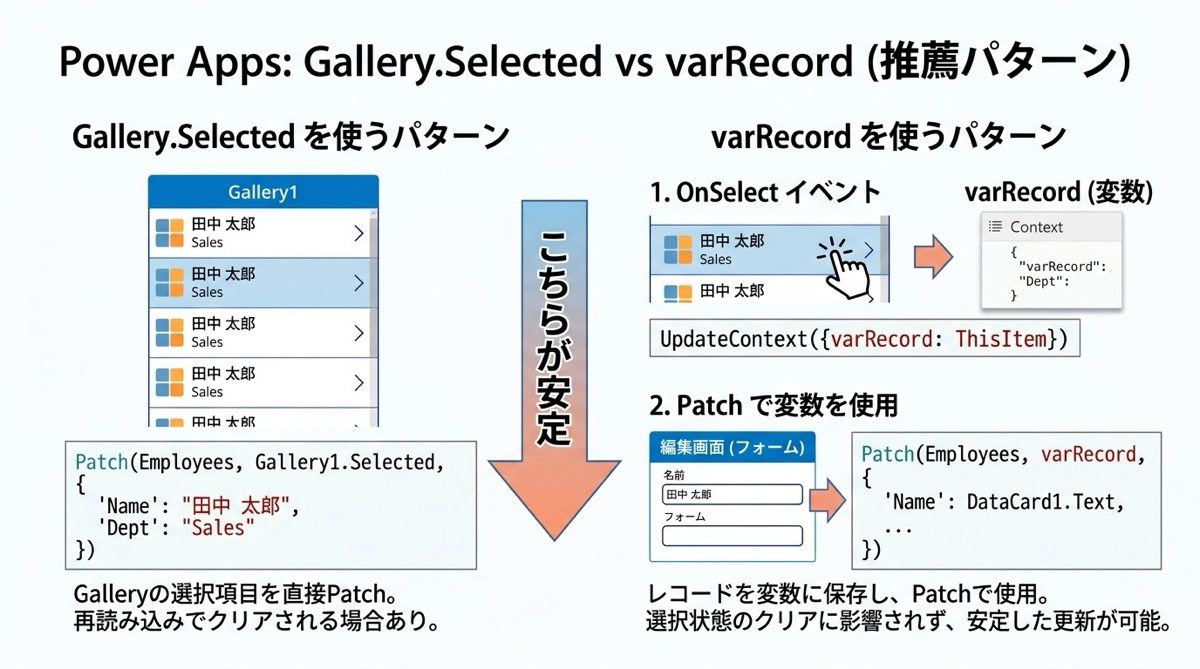 最初からvarRecordを使おうとすると、変数の概念とPatch関数の両方を同時に理解する必要があり混乱しやすいです。Gallery.Selectedを経由して段階を踏むことで、何がどう変わったのかが理解しやすくなります。