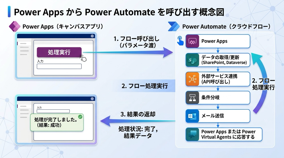 Power AppsからPower Automateを呼び出すのは、FlowName.Run() の1行で完結します。引数で値を渡し、Respond to a Power Appで結果を受け取る、という流れが基本パターンです。