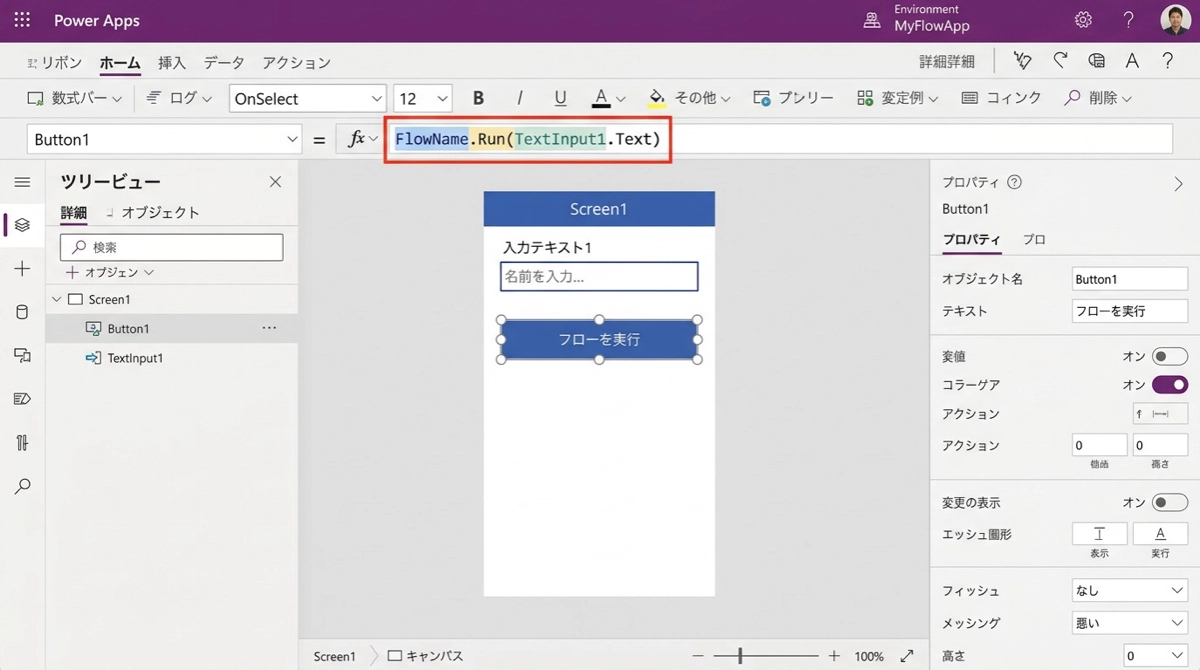 Power Apps Studio(アプリの編集画面)から直接フローを紐づけられます。手順は次のとおりです。
