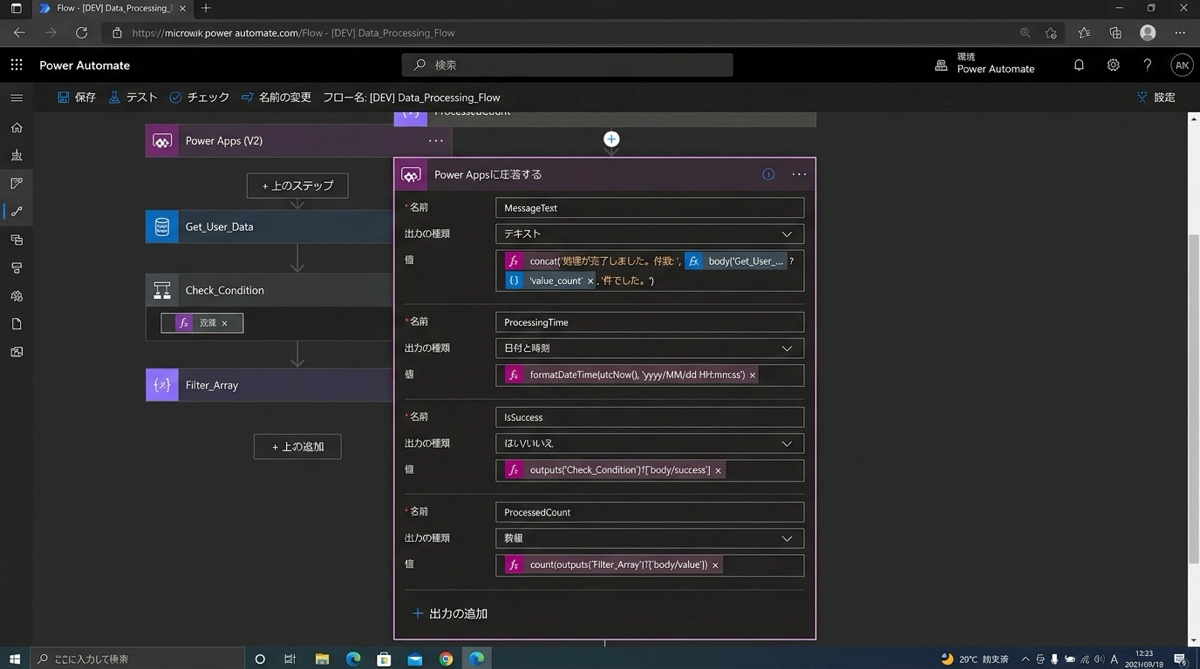 フローからApps側に値を返したい場合は、フローの最後に「Power Appsに応答する」アクション(Respond to a Power App)を追加します。返す値の名前と中身を定義すると、Apps側でフローの戻り値を取り出せます。