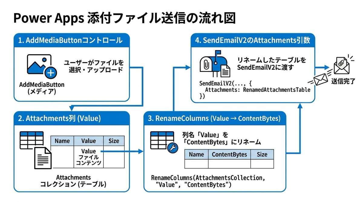 Attachment コントロールのデータは AddMediaButton1.Attachments などで取得できますが、列名が Value になっています。SendEmailV2 の Attachments 引数が期待する列名は ContentBytes です。そのため RenameColumns() で変換する必要があります。
