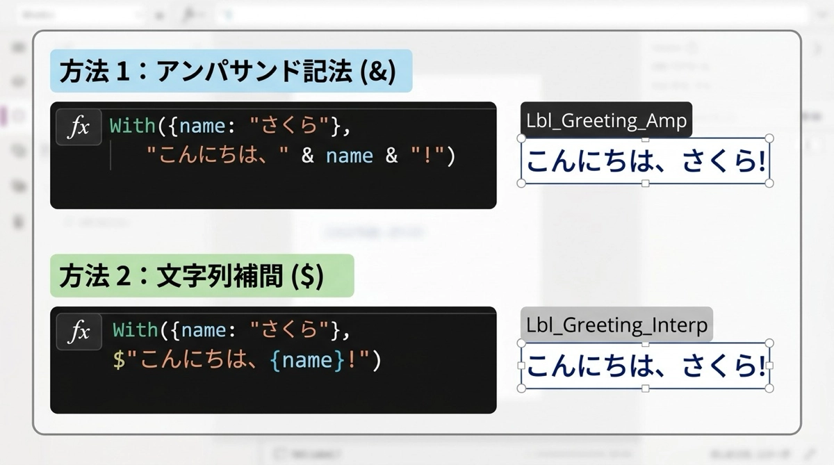 Power Appsには文字列を組み立てる方法が2つあります。従来からある & 演算子と、比較的新しい文字列補間($"...")です。どちらを使うかで数式の読みやすさが大きく変わります。