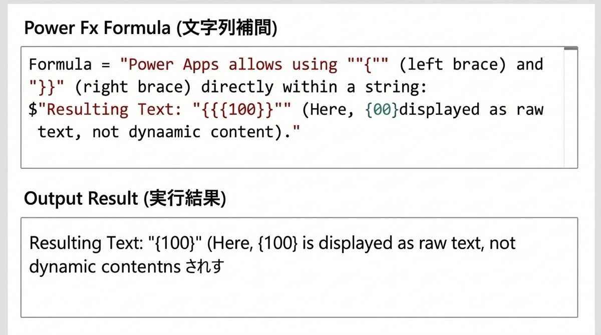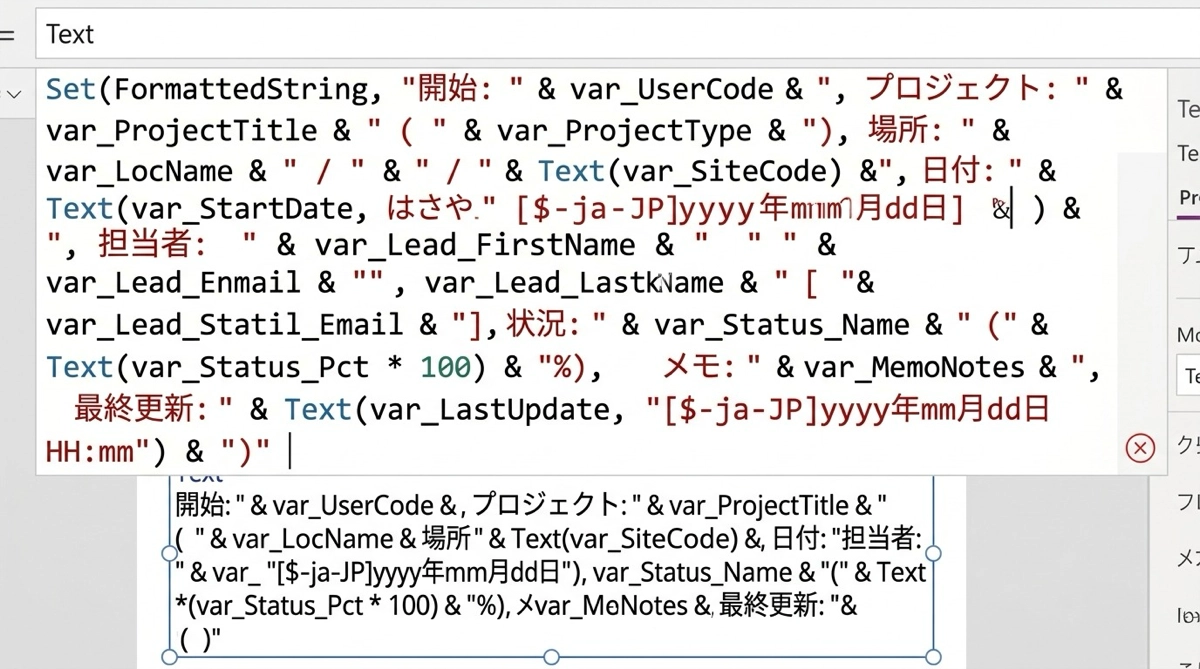 先ほどの & 記法と全く同じ結果になりますが、全体が1本の文字列として見え、変数や式の挿入箇所が {} で明確に示されます。私は社内の勉強会でPower Appsを教える立場ですが、文字列補間は初心者にも直感的に伝わりやすいと感じています。