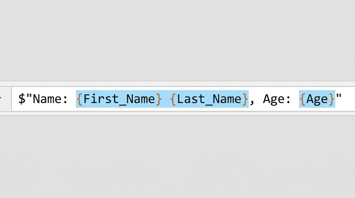 文字列補間は、文字列の中に波括弧 {} で変数や式を埋め込む書き方です。C#やJavaScriptのテンプレートリテラルに近い構文です。