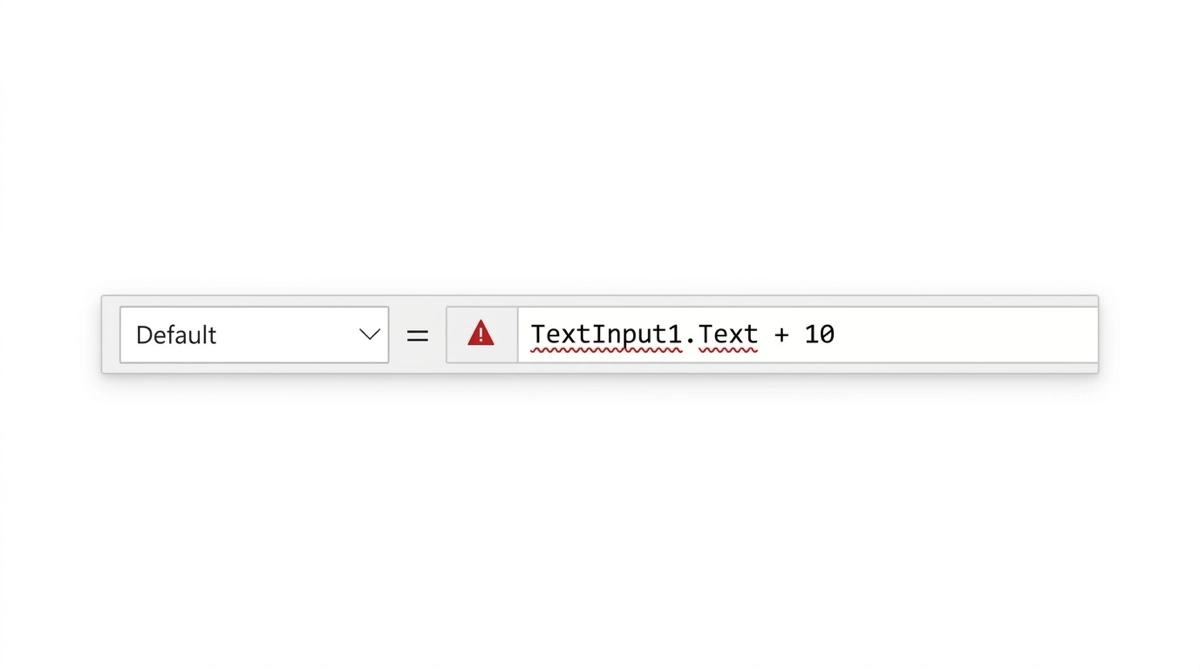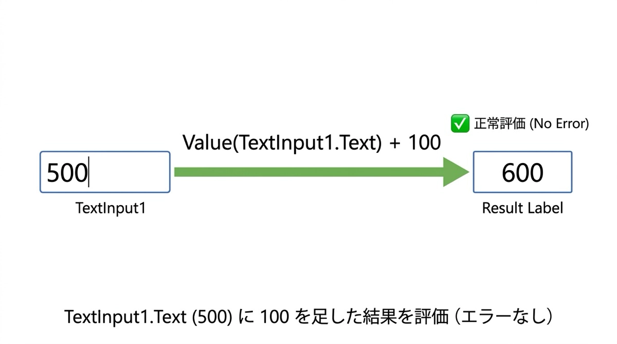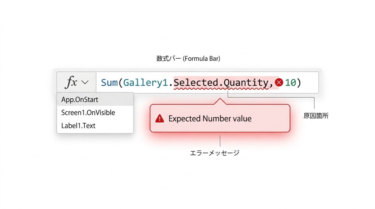 テキスト入力コントロールに入力した値は、数字に見えても型はテキスト(Text)です。そのまま計算式に使おうとすると、型の不一致を検知してエラーが出ます。数式バーに赤いアンダーラインが引かれ、マウスを乗せると Expected Number value のようなエラーメッセージが表示されます。