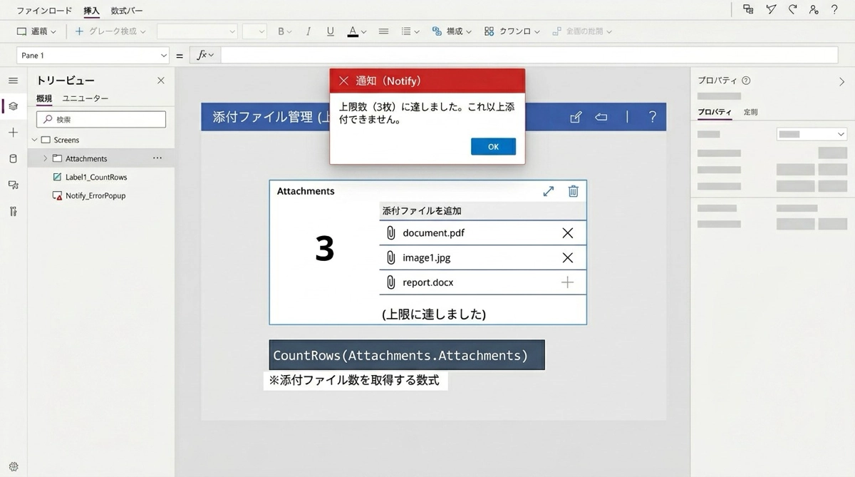 添付ファイルコントロールの .Attachments プロパティは、添付されているファイルのテーブル(コレクション)を返します。これを CountRows 関数に渡せば、現在の添付枚数をリアルタイムに取得できます。