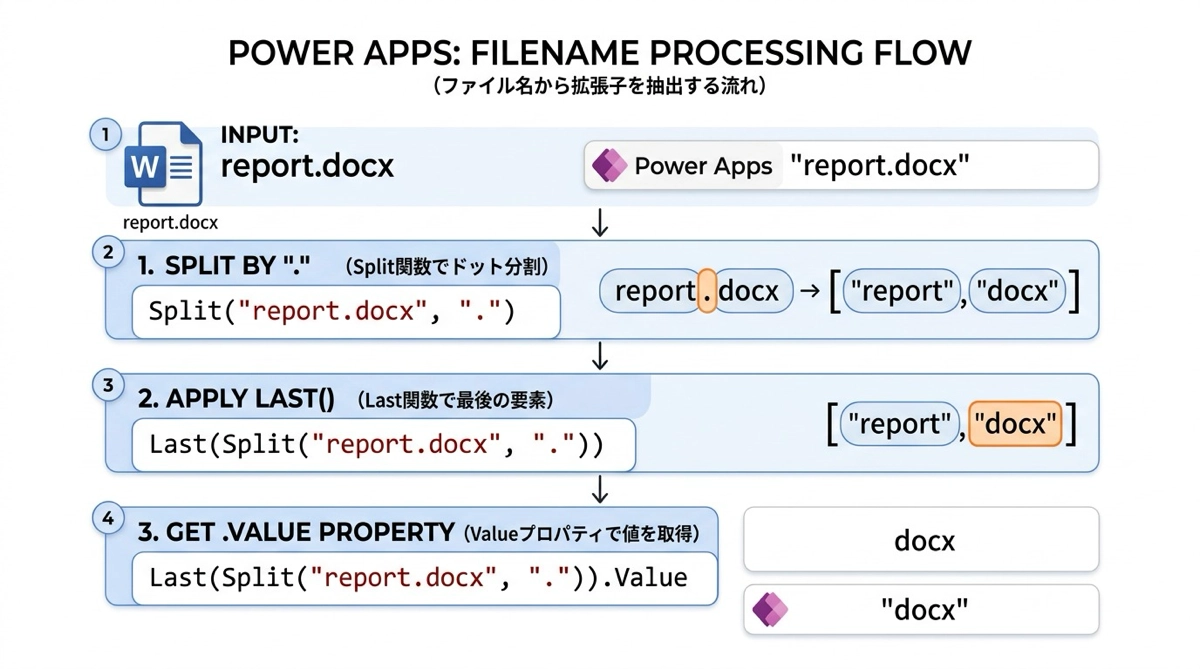 枚数だけでなくPDFしか添付できないといった拡張子の制限も、同じく OnAddFile プロパティで実装できます。ファイル名から拡張子を取り出すには Split 関数を使います。ファイル名をドット(.)で分割して末尾の要素を取れば、拡張子だけを抽出できます。Split 関数についてはテキスト関数の解説記事でも触れていますが、この使い方は特に実用的です。