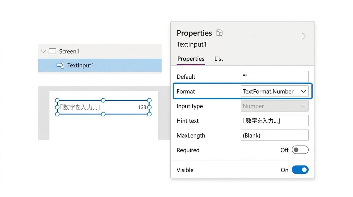 スマホで数量を入力するたびに、日本語キーボードから数字キーボードに切り替えるのは地味にストレスです。Power Appsのテキスト入力コントロールにはFormatプロパティという設定があり、これを変えるだけでスマホに数値専用キーボードを自動表示させることができます。入力ミス防止の設計全体についてはPower Apps入力ミス防止ガイドでまとめているので、スマホ向けフォーム設計の参考に合わせてどうぞ。