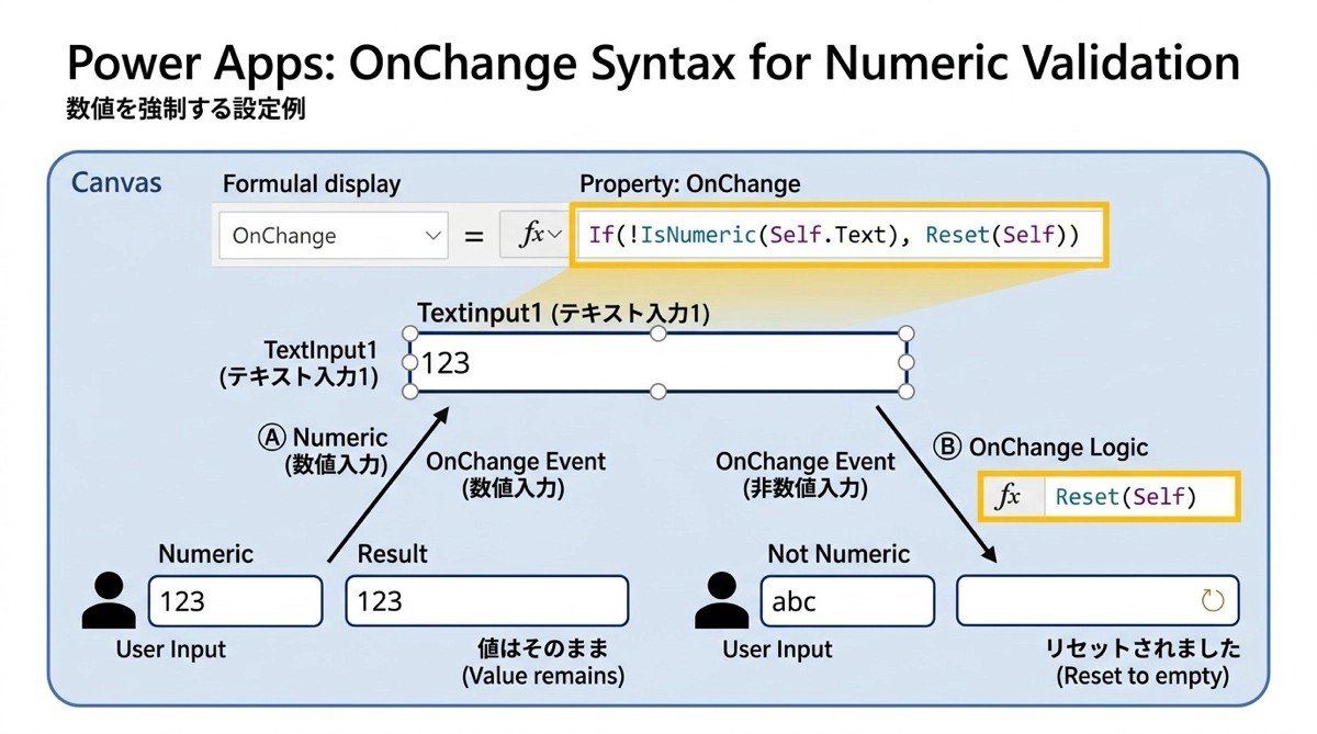 IsNumeric関数は、渡した文字列が数値として解釈できるかどうかをtrue/falseで返します。テキスト入力コントロールのOnChangeプロパティに条件チェックを入れておくと、数値以外が入力されたときに自動でリセットできます。