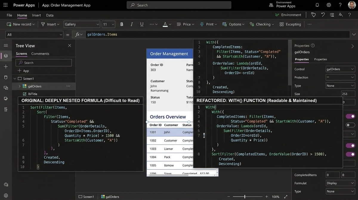 Power AppsのWith関数は、複雑な数式を見やすく整理するためのツールです。ネストが深くなった数式や、同じ計算を何度も繰り返している数式があれば、With関数で書き直すと一気にスッキリします。
