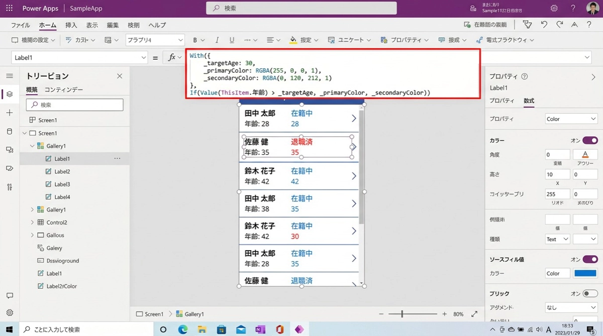 例えば、ギャラリーの各アイテムについて「ステータスに応じた色」と「期限切れかどうかの判定」を同時に使う数式はこうなりがちです。
