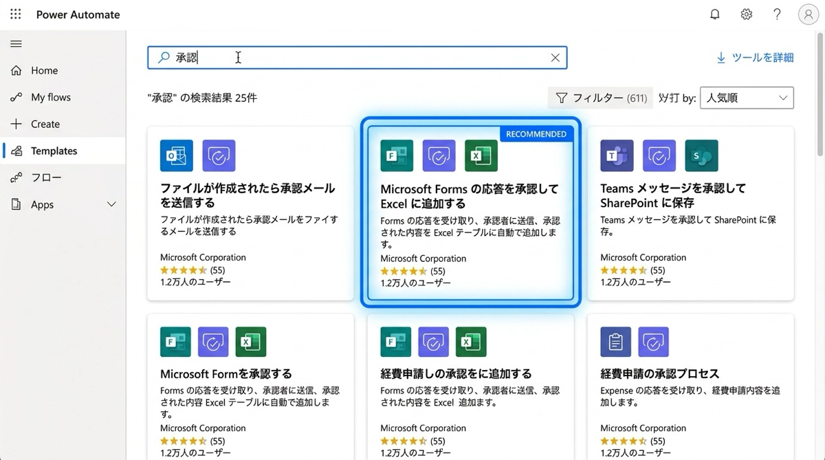 Power Automate の画面を開き、左メニューのテンプレートをクリックします。検索欄に承認と入力すると、承認に関するテンプレートが一覧表示されます。その中から Microsoft Forms の応答を承認して Excel に追加する、を選んでください。
