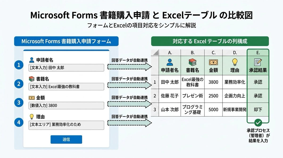 - Microsoft Forms で申請フォームを作成する(例:書籍購入申請フォーム。申請者名・書籍名・金額・理由の4項目)