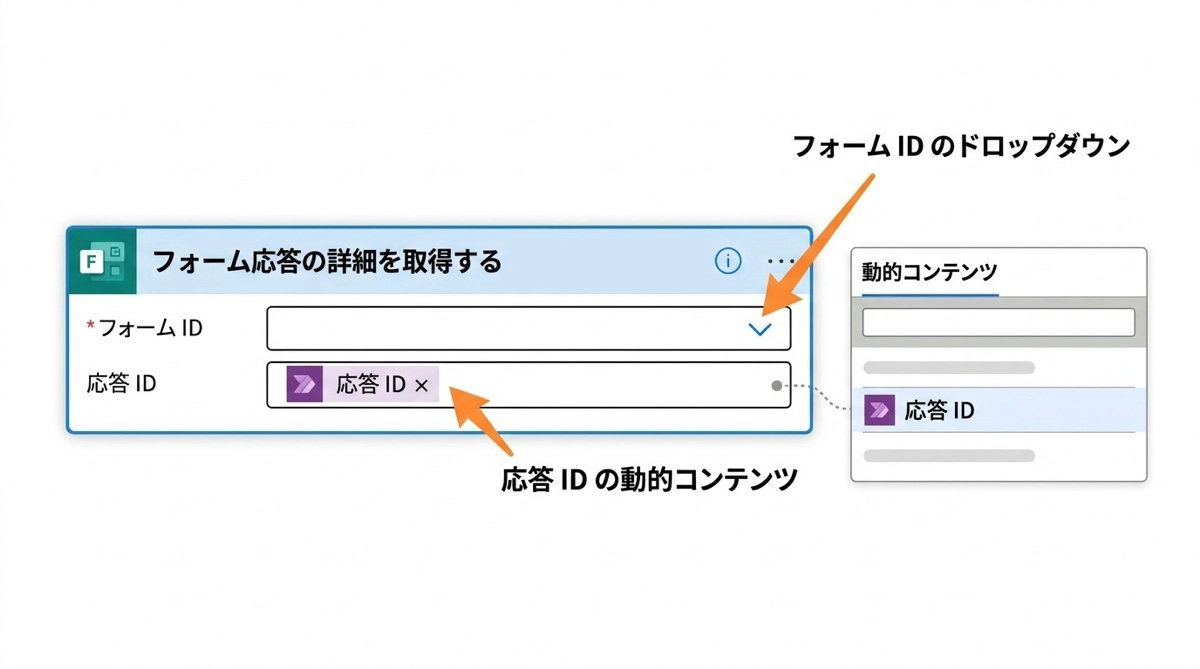 次にフォーム応答の詳細を取得するアクション(Get response details)に進みます。ここでも同じフォームを選んだうえで、応答IDの欄に動的コンテンツから応答IDを差し込みます。この応答IDの挿入を忘れると、毎回同じ回答しか取得できないというバグが発生します。私が最初に作ったときもここで詰まりました。動的コンテンツのパネルで応答IDが見つからない場合は、一度フォームIDを別の選択肢にしてから戻すと表示されることがあります。