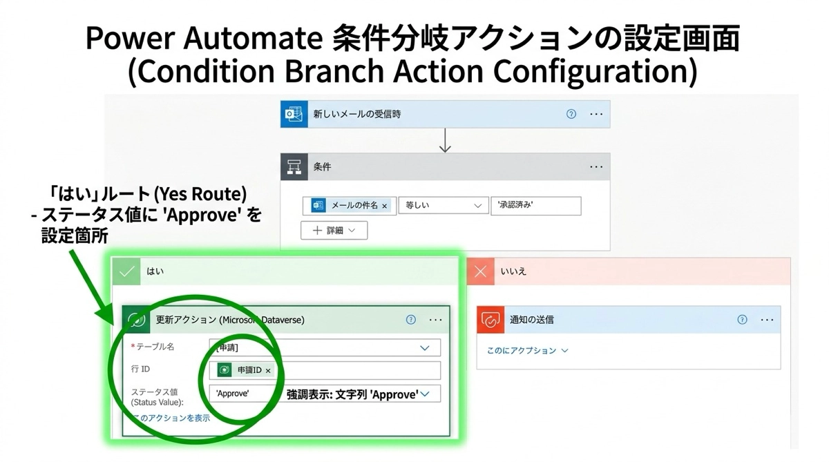 テンプレートのデフォルトでは、結果が Approve と等しい場合を承認ルートにしていることがあります。しかし、実際の承認コネクタが返す値は Approve です(スペルに問題はありませんが、大文字・小文字が厳密に一致しているかを確認してください)。条件式の右辺の文字列が正しく Approve になっているかを確認し、必要であれば修正してください。特にテンプレートによっては approved と小文字になっているケースがあります。