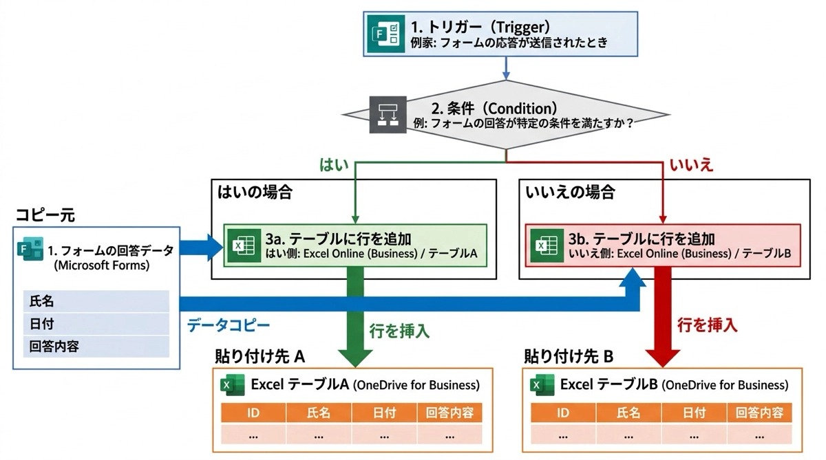 条件分岐の「はい(承認)」ルートには Excel にデータを追加するアクション「テーブルに行を追加」が入っています。却下側にも同じ処理を入れたい場合、ゼロから設定し直す必要はありません。承認ルートのアクションを右クリックしてコピーし、却下(いいえ)ルートにペーストするだけです。