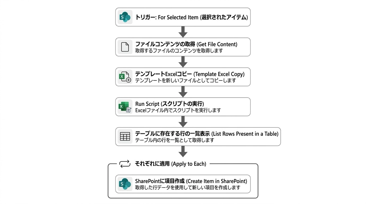- List rows present in a table → Apply to each(それぞれに適用)→ Create item(項目の作成)でSharePointに取り込み