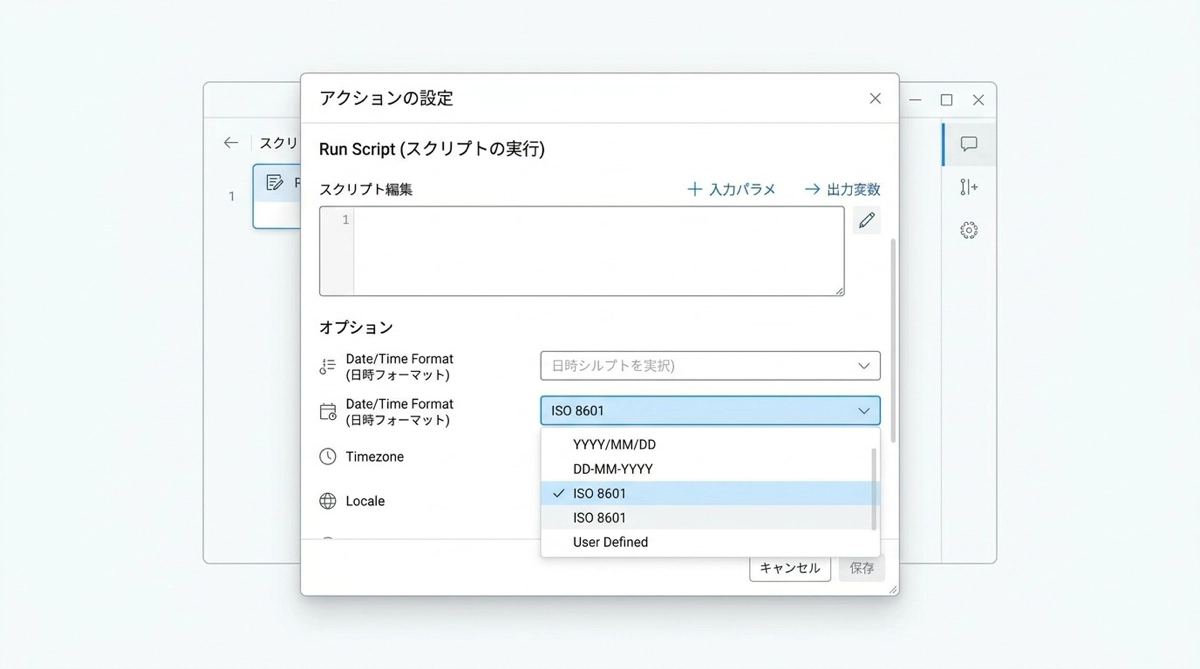 ExcelでCSVの日付を取り込むとデフォルトではシリアル番号(43061など)で保存されることがあります。Run Script(スクリプトの実行)アクションのオプションでDate/Time FormatをISO 8601に変更すると、正しい日付形式に変換できます。フローを組んだ後に日付の列が数字になっているという問題に気づくパターンが多いので、最初からDate/Timeの設定を確認する習慣をつけておくと手戻りが減ります。